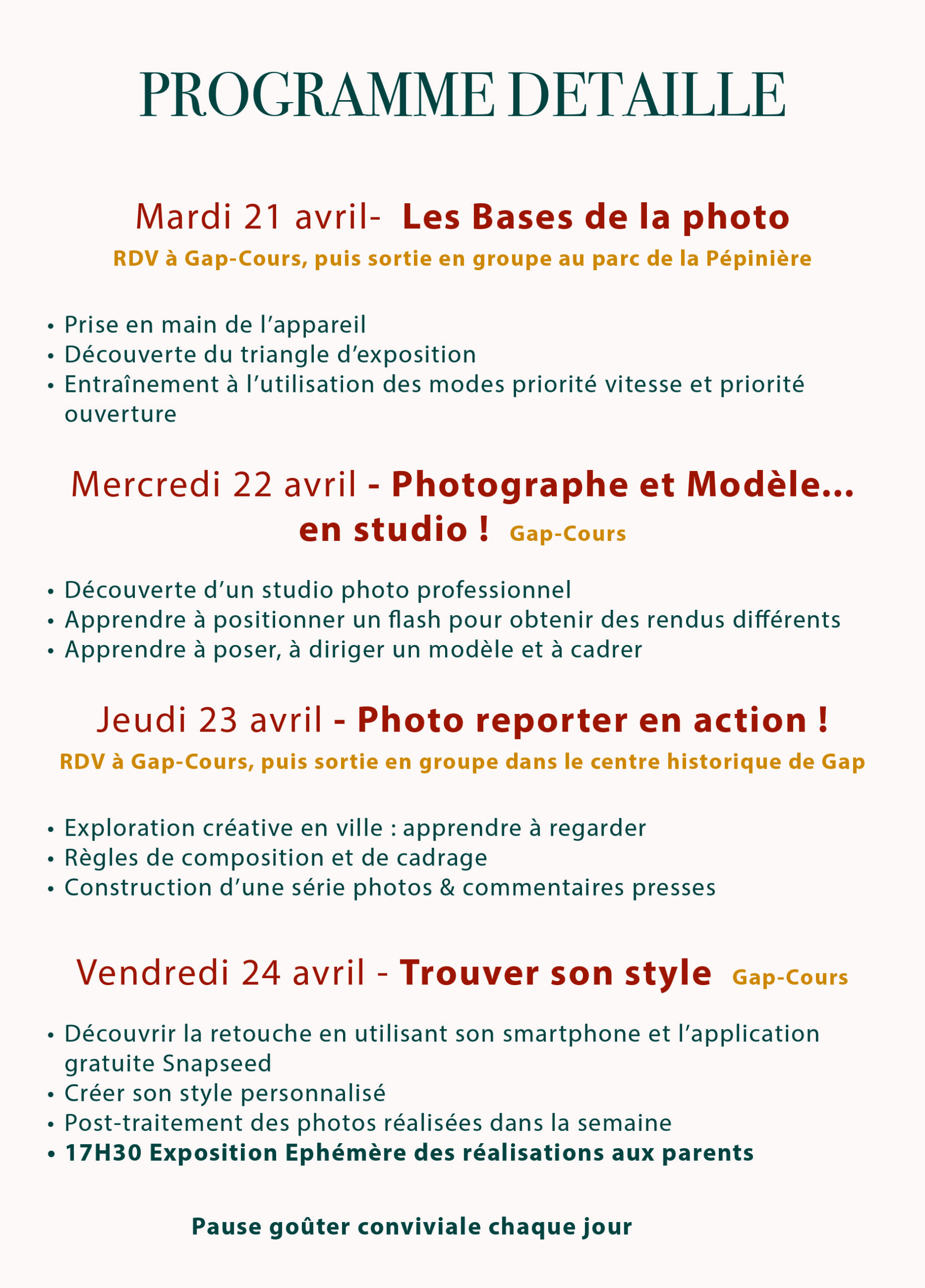 Ce stage se déroule sur 4 demi-journées du mardi 21 au vendredi 24 avril 2026 de 14h30 à 17h30 dans les locaux de Gap-Cours.